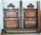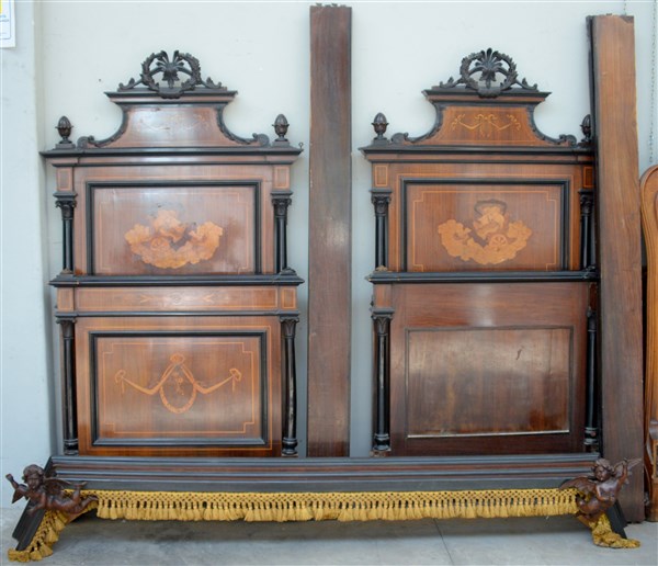Coppia di letti singoli con testate e pediere intarsiati, montanti e profili ebanizzati. Con baldacchino e putti a tutto tondo. Secolo XIX (difetti e mancanze)