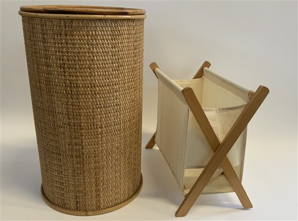Lotto composto da un portaombrelli in midollino ed un portariviste in legno e tessuto (lievi difetti)