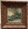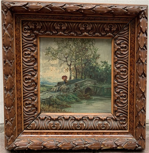Ignoto "Paesaggio con pastorella e pecore su un ponte" olio su compensato (cm 28.5x27) in cornice in legno scolpito (difetti)