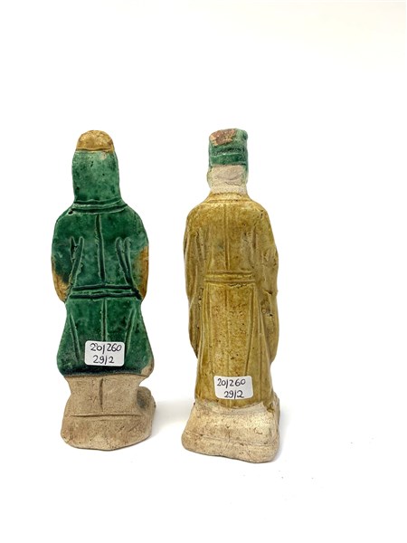 Due statuine a smalto sancai. Cina, dinastia Ming (1368-1644)(h max cm 13) (difetti)