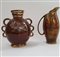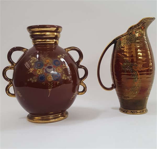 Lotto composto da una brocca in ceramica smaltata in policromia sottovetrina marcata sotto la base M.I.C.A.unita a un vaso biansato in ceramica policroma smaltata con decoro orientalista marcata sotto la base Crown Devon. (Brocca cm h 27; vaso cm h 26,5) (lievi difetti)