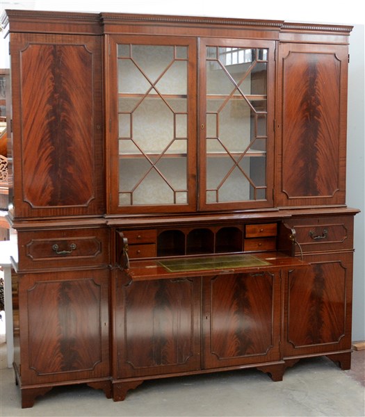 Mobile libreria inglese in mogano a due corpi con parte inferiore a sportelli e piano ribaltabile a scrittoio, parte superiore con vetrina centrale (cm 195x200x48)