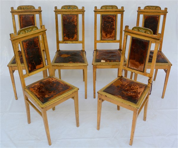 Lotto di sei sedie liberty con struttura in legno, schienale intagliato a motivi florale rivestimento in cuoio stampato a motivi vegetali a rilievo. Italia, 1900ca. (cm 41,5x100x5') (Gravi difetti, restauri e mancanze)