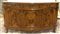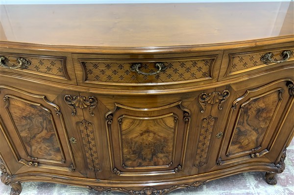 Credenza di forma sagomata a tre casetti e tre ante decorate da pannelli in radica (cm 200x100x549 (difetti)