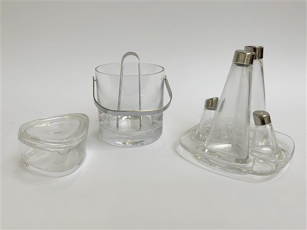 Lotto composto da un set per condimento, una formaggera con coperchio e un portaghiaccio in cristallo, alcuni marcati