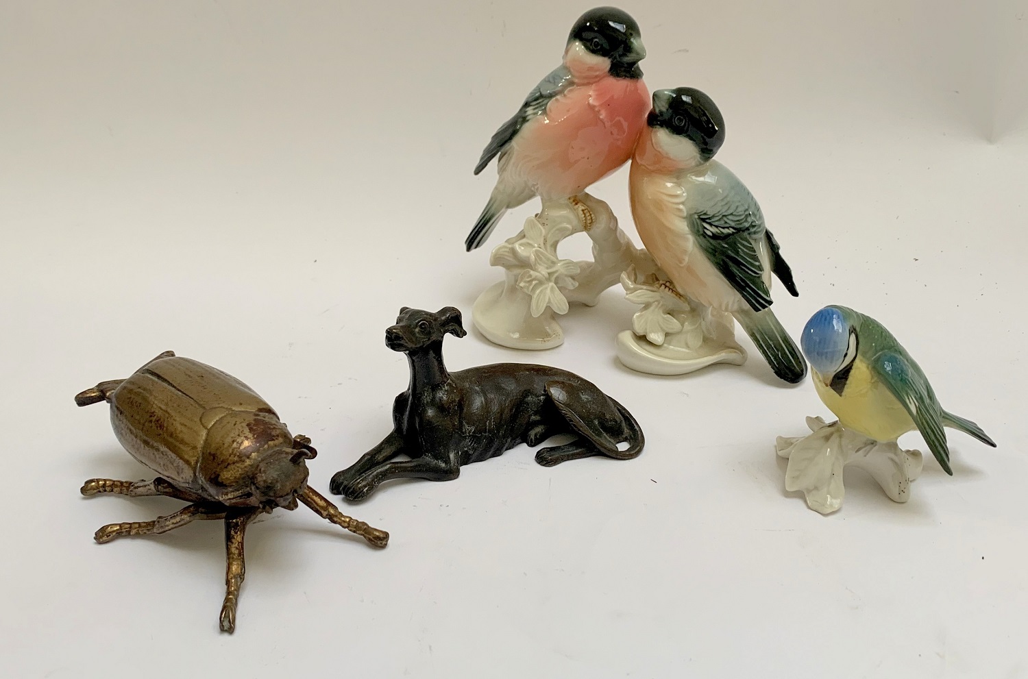 Manifatture differenti. Lotto composto da due gruppi in porcellana policroma raffiguranti passerotti su ramo fiorito uniti a un levriero in bronzo e uno scarabeo ottone (difetti)