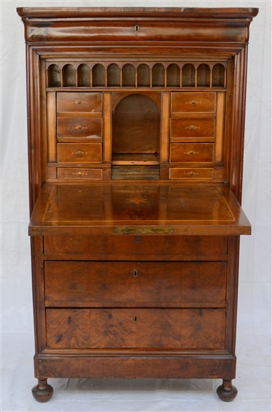 Secretaire lastronato e filettato con fronte a quattro cassetti e anta ribaltabile celante scarabattolo architettonico con vani e cassettini. Piedi a cipolla. Secolo XIX (cm 95x172x46)