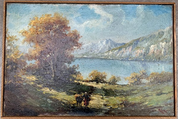 Lotto 1724 | Firma indecifrata "Paesaggio con lago alpino e contadinella" olio su tela (cm 3