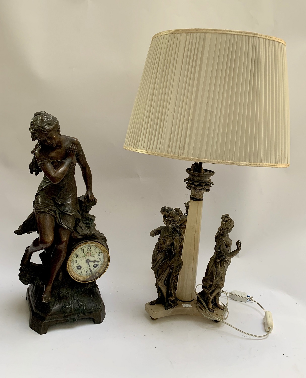 Lotto formato da una lampada in alabastro con allegorie delle arti a tutto tondo ed un orologio in antimonio patinato raffigurante una fanciulla assisa con . quadrante in smalto decorato a cifre arabe e movimento settimanale con suoneria delle ore e mezze. Epoca orologio: Francia fine XIX inizio XX Secolo. Misure orologio h cm 47. (difetti e mancanze)