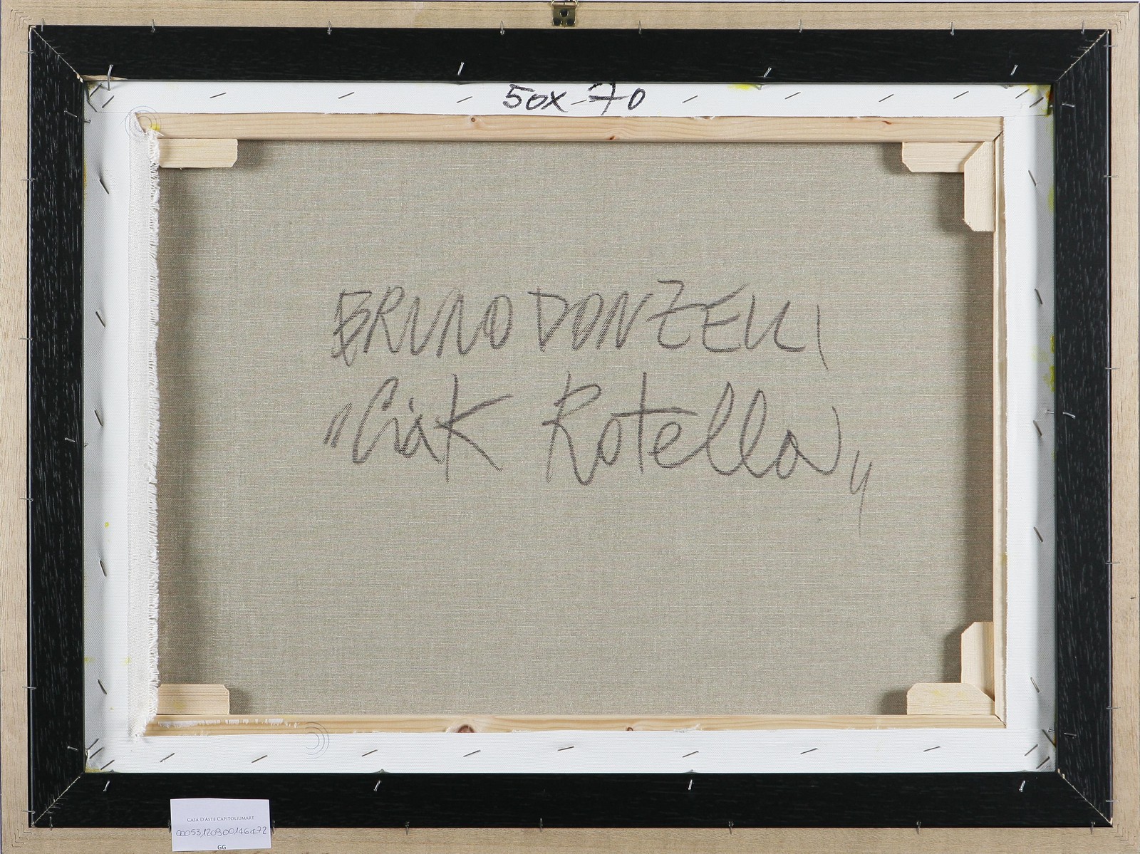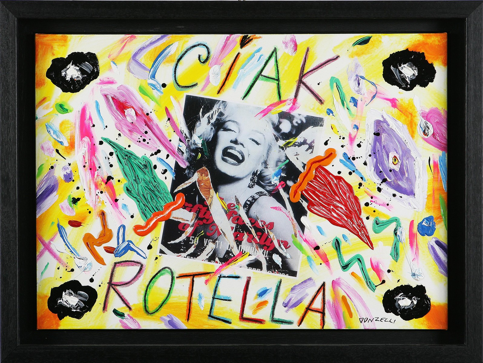 DONZELLI BRUNO (n. 1941) Ciak Rotella. Tecnica mista su tela. Cm 50x69,5. Autentica dell'artista su fotografia. Firma in basso a destra. Al retro firma, titolo e misure.
