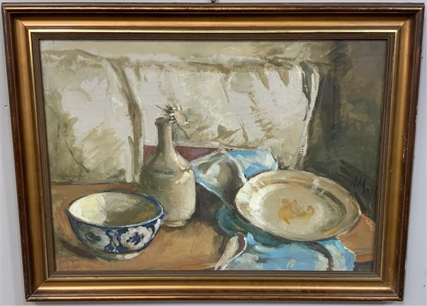 Adolfo Mutti "Composizione con piatto ciotola e bottiglia" olio su cartone cm 5