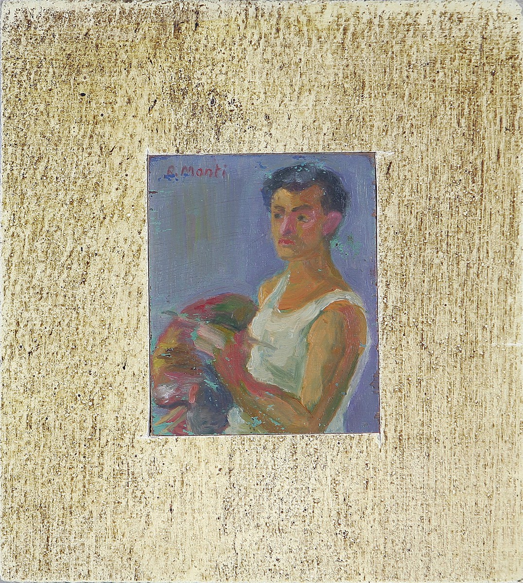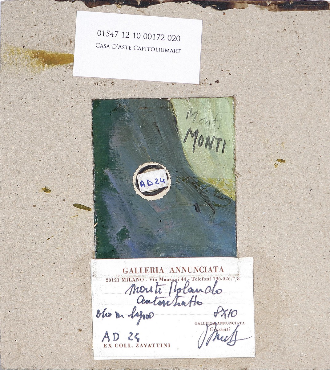 MONTI ROLANDO (1906 - 1991) Autoritratto. Olio su tavoletta. Cm 8x10. Firma in alto a sinistra. Al retro firma e cartiglio della Galleria Annunciata, Milano.