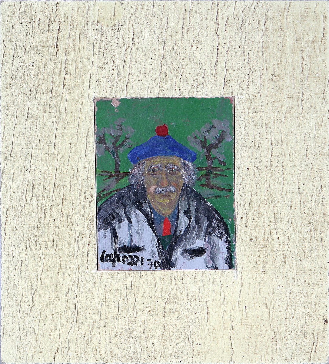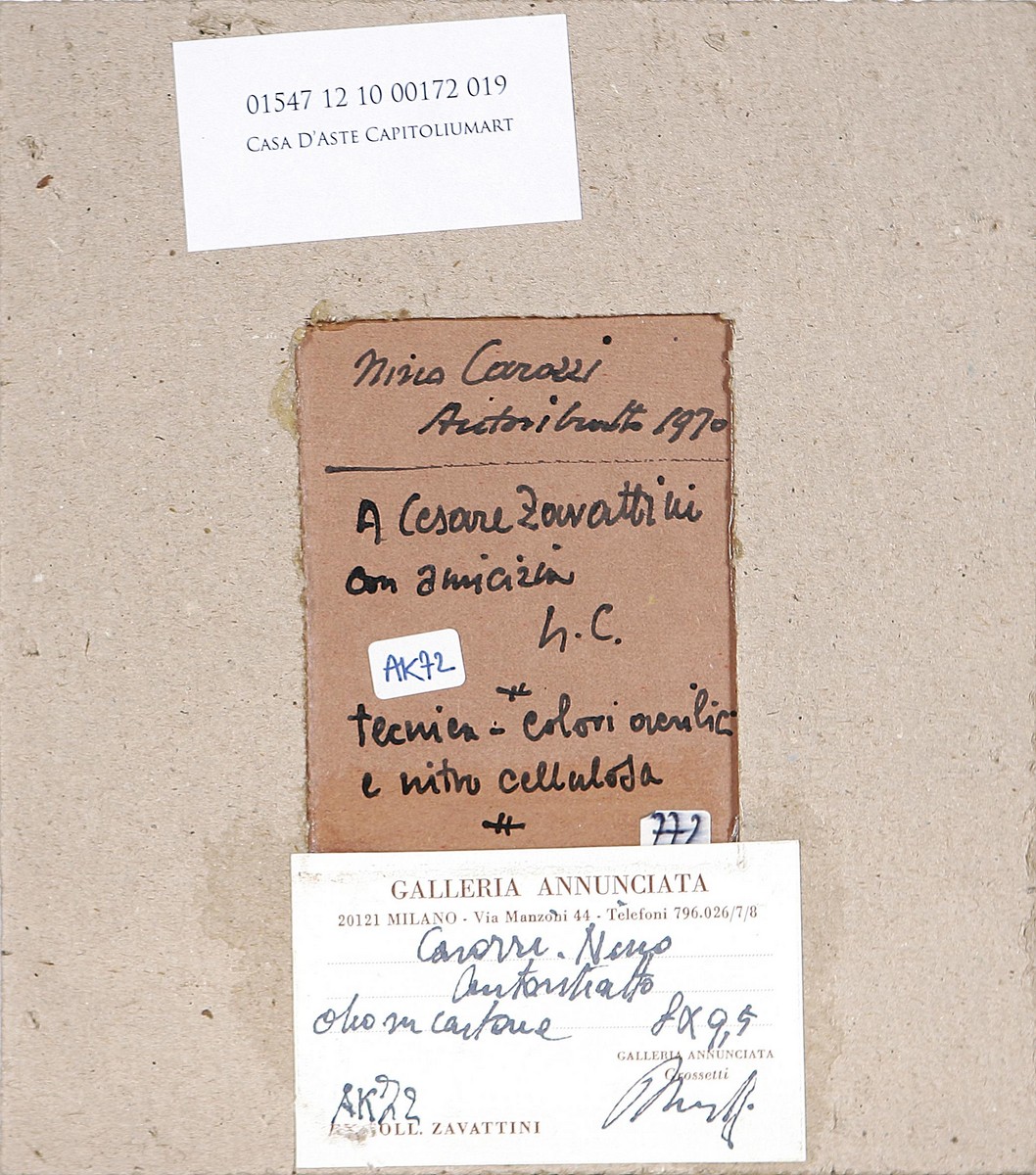 CAROZZI NINO Autoritratto, 1970. acrilico su tavoletta. Cm 9,5x8. Provenienza: Collezione zavattini. Firma e data in basso a sinistra. Al retro titolo, firma, anno e dedica a Cesare Zavattini; cartiglio della Galleria Annunciata, milano.