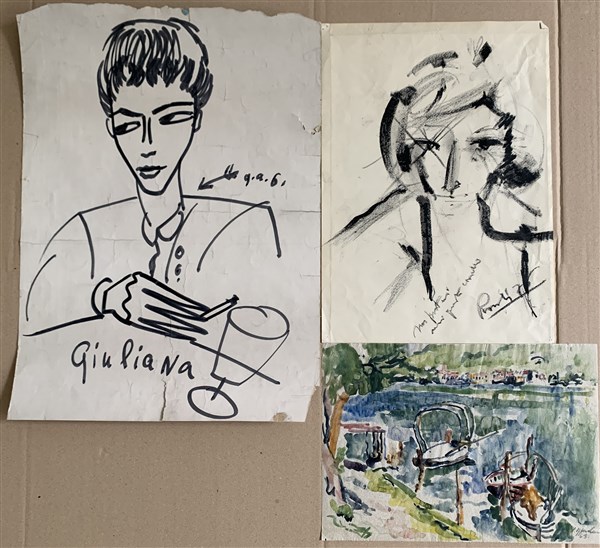 Lotto composto da un acquarello di Annemarie Oppenheim raffigurante una veduta lacustre (cm 21x29), firmato e datato '63, unito a due disegni raffiguranti volti, di autori, tecniche e misure diverse