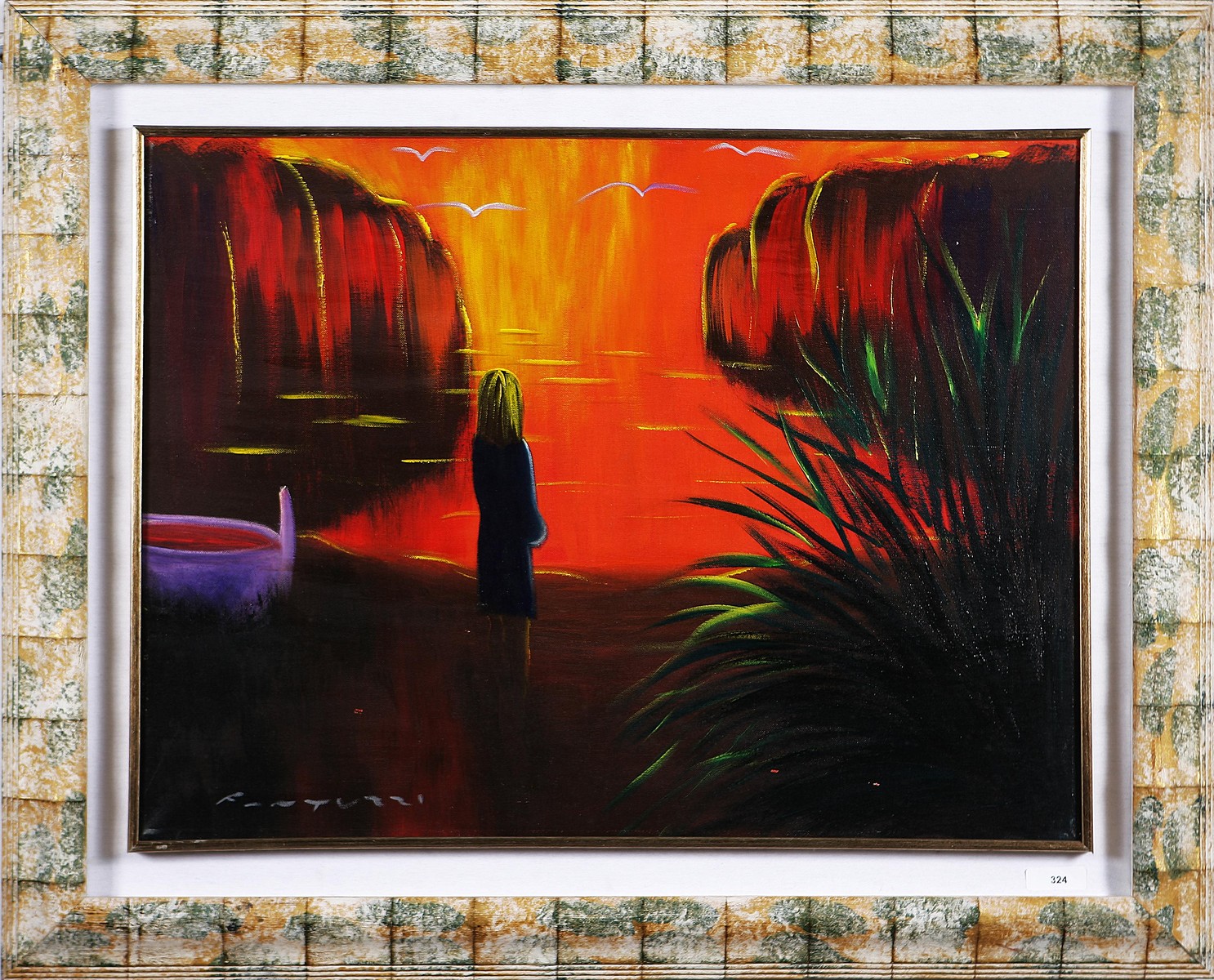 FANTUZZI ELIANO (1909 - 1987) Paesaggio con figura. Olio su tela. Cm 60x80. Firma in basso a sinistra. Al retro firma per autentica.