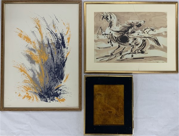 Lotto composto da due multipli a tecnica mista, di autori diversi e una riproduzione di un'acquerello di Sassu
