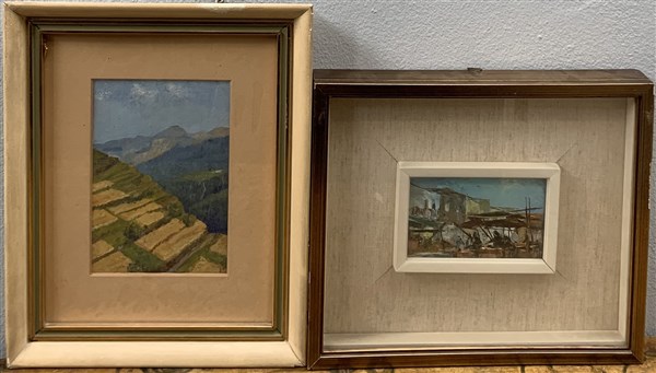 lotto di due dipinti ad olio su tavoletta, raffiguranti scorcio di mercato e paesaggio, autori e misure diverse