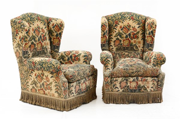 Coppia di bergère su rotelle rivestite in tessuto a fiori. Italia, anni '60/'70. (cm 78x108x80) (lievi difetti e restauri)