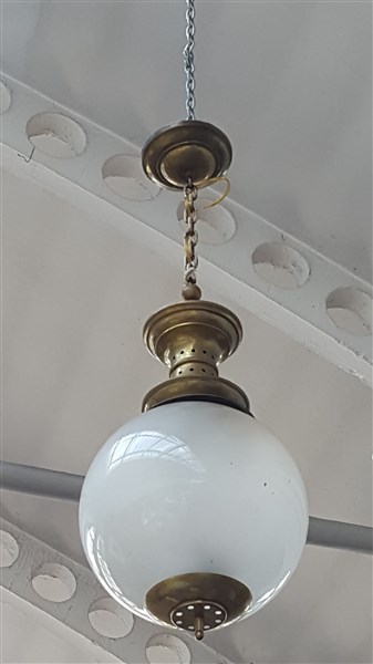 Lampada a sospensione modello "LS1GC lampione". Produzione Azucena, Milano, 1954. Ottone e vetro soffiato satinato sulla superficie interna. (h cm 85; d cm 30) (difetti e manomissioni)
