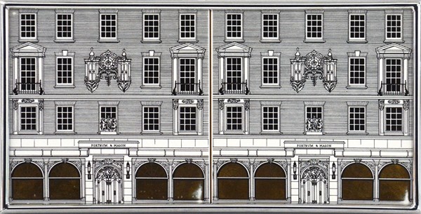 Coppia di piastrelle in ceramica serigrafata in nero e oro raffiguranti la facciata del centro commerciale Fortum & Mason di Londra. Anni '90. In cornice. (cm 30x15,5) (lievi difetti)