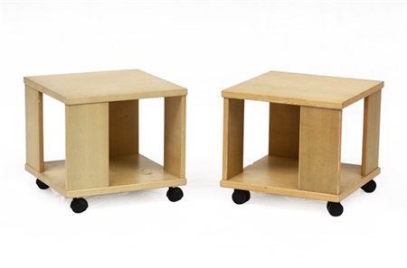 Coppia di comodini su rotelle in legno di betulla bordato e impiallacciato. Ita