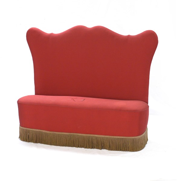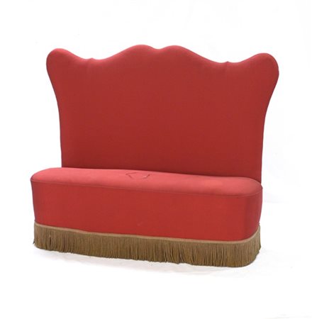 Divanetto da ingresso con schienale sagomato imbottito e rivestito in tessuto rosso. Italia, anni '50. (cm 140x113x40) (difetti)
