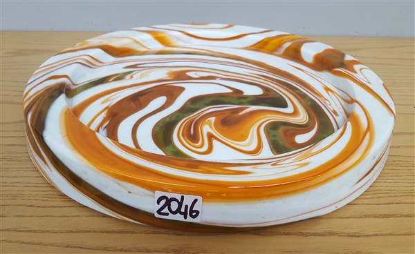 Centrotavola in pasta vitrea lattimo con decori arancione e verde. Seconda metà secolo XX. (d cm 29) (difetti)