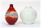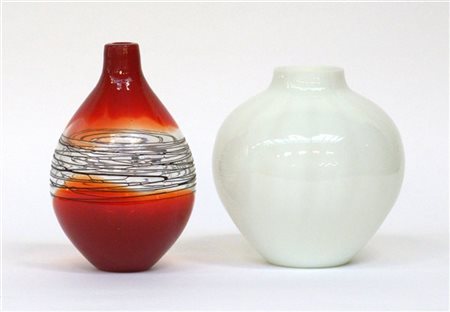 Lotto composto da due vasi: uno leggermente costolato di forma sferica in vetro lattimo, l'altro a bottiglia in vetro massello trasparente incolore e rosso con applicazioni a caldo nella parte centrale di fili in vetro ametista. Italia, anni '90. (h max cm 24)
