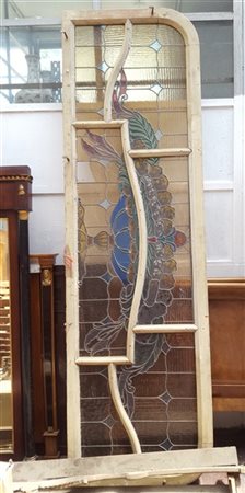 Vetrata policroma sovraporta con struttura in legno massello, tessere legate a piombo raffiguranti una coppa fiorita. Italia, anni '10/'20. (cm 72x243x86,5) (difetti e mancanze)