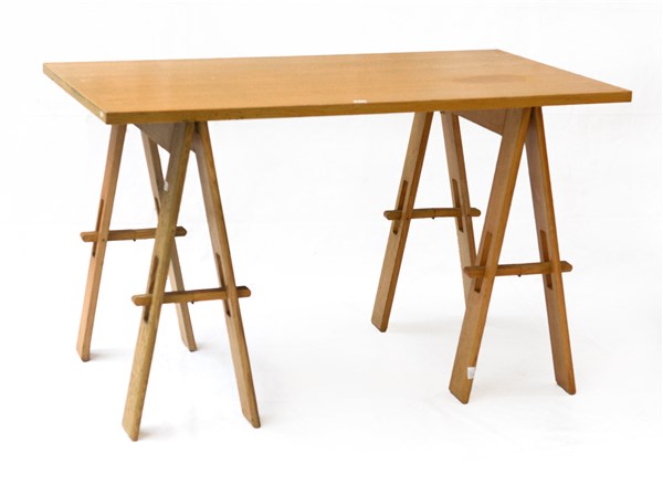 Scrivania a cavalletto. Produzione Acerbis, Italia, 1968. Legno di faggio massello e impiallacciato. Recante etichetta della produzione sulla gamba. (cm 120x72x70) (difetti)