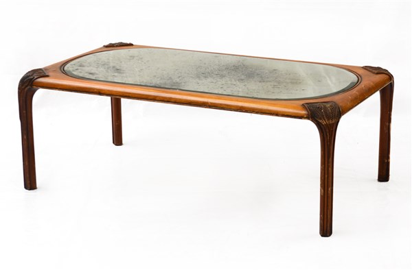 Tavolino in legno massello con angolari intagliati a motivi vegetali e piano centrale a specchio. Italia, anni '20/'30. (cm 116x42x66,5) (difetti)