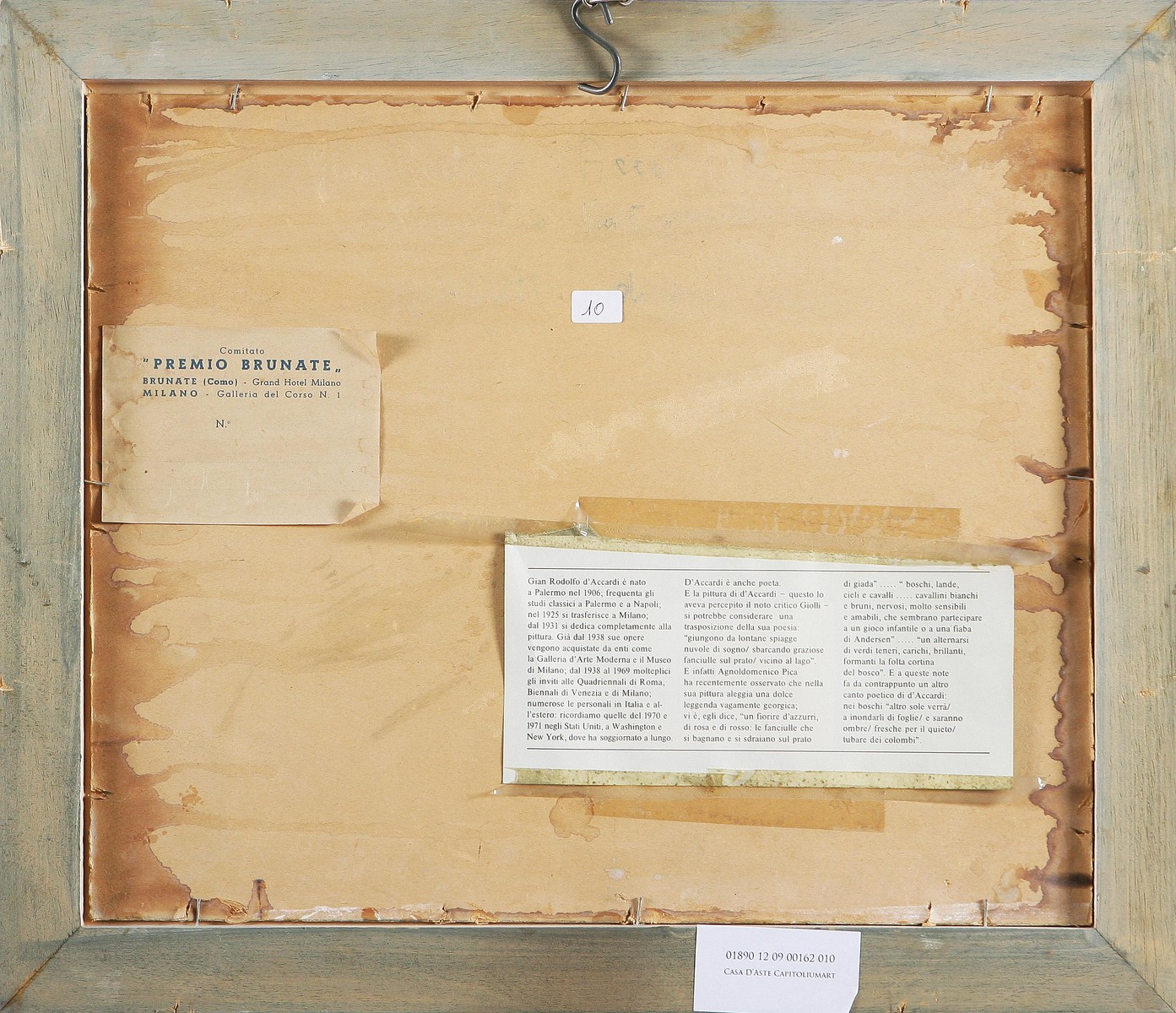 D'ACCARDI GIANRODOLFO (1906 - 1993) Fontana. Olio su cartone. Cm 34x42. Firma in basso a destra. Al retro cartiglio descrittivo della vita dell'artista e cartiglio del Comitato -Premio Brunate- di Como e Milano.