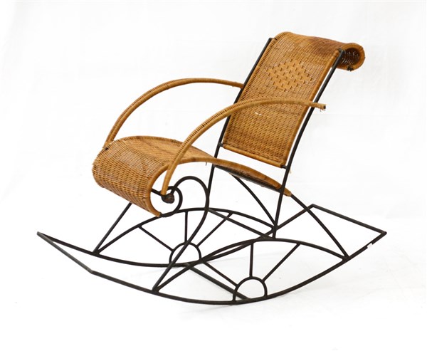 Poltrona a dondolo con seduta e schienale in midollino, struttura in ferro battuto. Prima metà secolo XX. (cm 120x90x63) (gravi difetti)