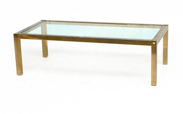 Tavolino da salotto con piano in vetro e struttura in metallo ottonato. Italia, anni '70. (cm 120x36,5x60) (difetti)