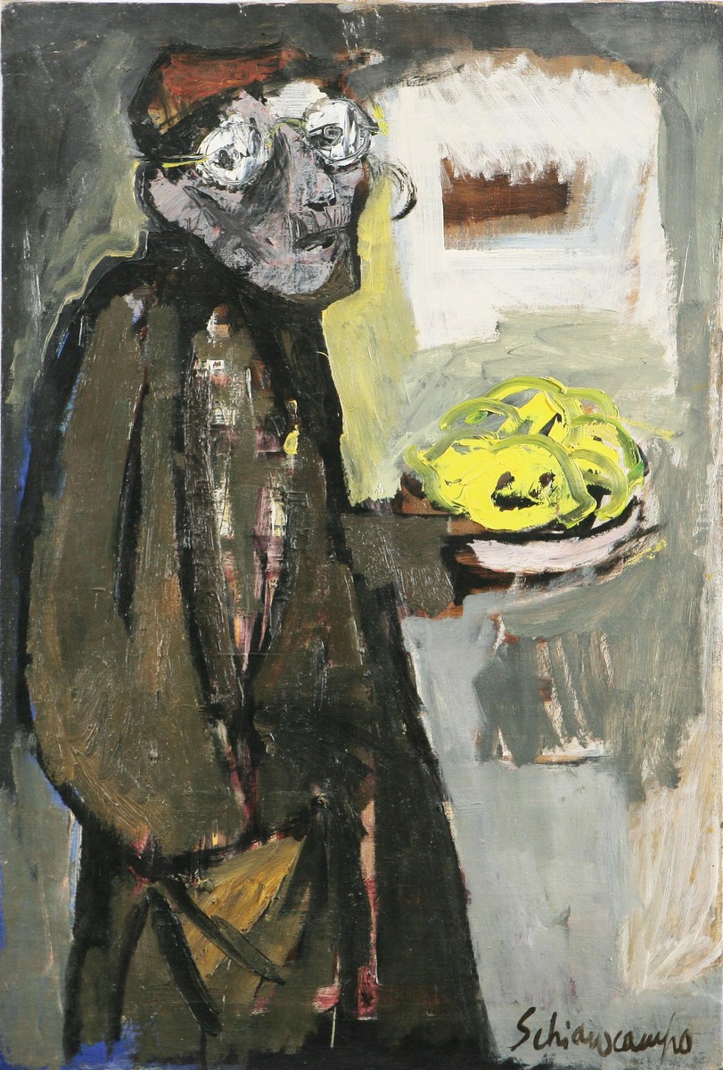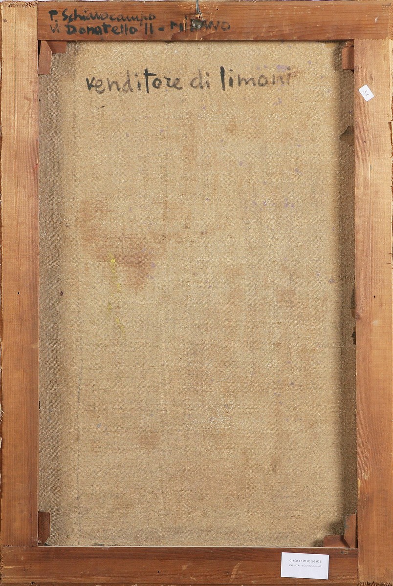 SCHIAVOCAMPO PAOLO (n. 1924) Venditore di limoni. Olio su tela. Cm 88x60. Certificato di autenticità e provenienza su fotografia a firma illeggibile.. Firma in basso a destra. Al retro titolo e firma.