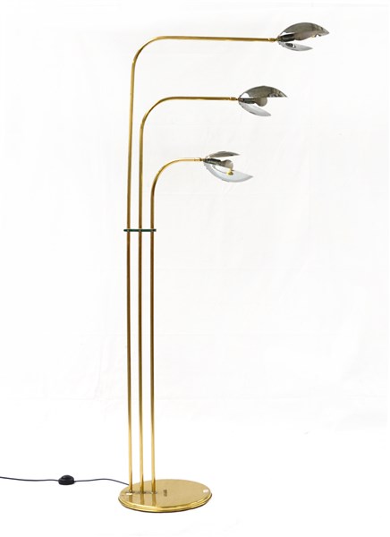 Lampada da terra a tre luci con base e struttura in ottone, paralumi a forma di conchiglia in alluminio. Italia, anni '90. (h cm 180) (difetti)