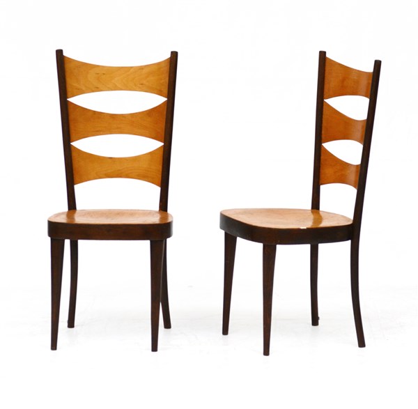 Coppia di sedie in legno massello e compensato. Ponte San Pietro, anni '70. Marcate a fuoco sotto la seduta. (cm 40x95x41) (lievi difetti)