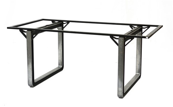 Tavolo. Produzione Tecno, Italia, anni '70. Struttura in alluminio presso fuso e metallo verniciato nero. Recante marchio del produttore. (cm 160x68x82) (difetti e mancanza del piano)