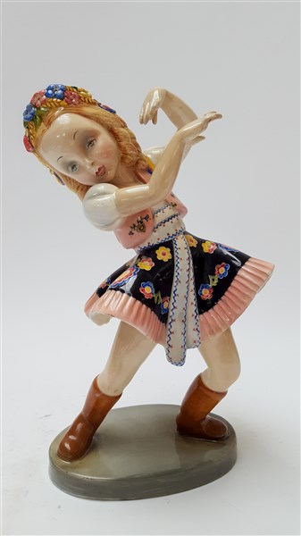 Scultura in ceramica formata a colaggio e smaltata in policromia sotto vetrina. Torino, anni '30. Recante firma sotto la base "C.I.A. Torino Balletto Ungherese". (h cm 34,5) (lievi difetti e restauri)