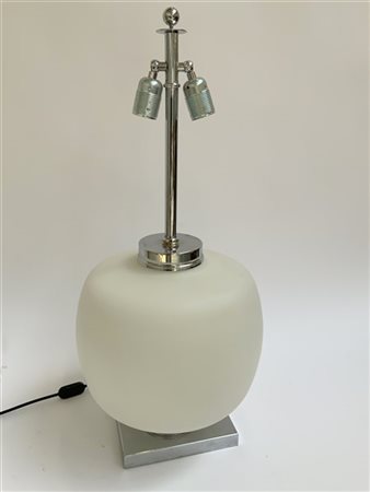 Lampada da tavolo a due luci in vetro, incamiciato lattimo satinato, struttura in metallo. Italia, anni '90/2000. (h cm 77) (lievi difetti e mancanze)