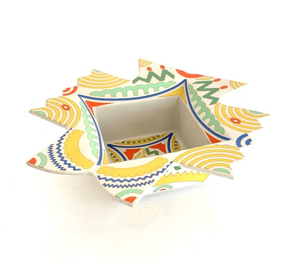Centrotavola in ceramica smaltata in policromia e decorata a motivi geometrici. Manifattura Rosenthal, Germania, 1957ca. Firmata "Laura Fiume". (cm 30x8)