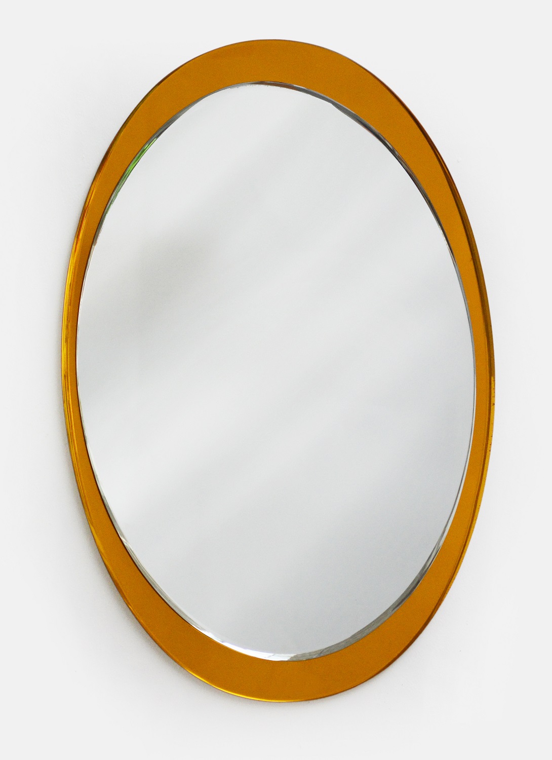 Metalvetro Specchiera ovale con cornice specchiata arancione. Siena, 1973. Recan