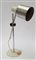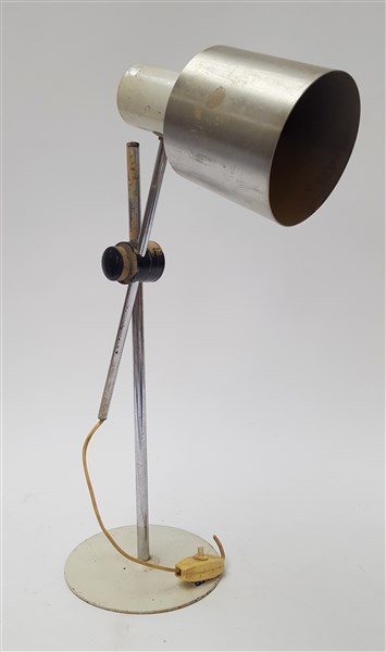 Lampada da tavolo con braccio orientabile e regolabile in acciaio e alluminio naturale e verniciato bianco, plastica. Italia, anni '60/'70. (h fusto fisso cm 41) (difetti)