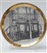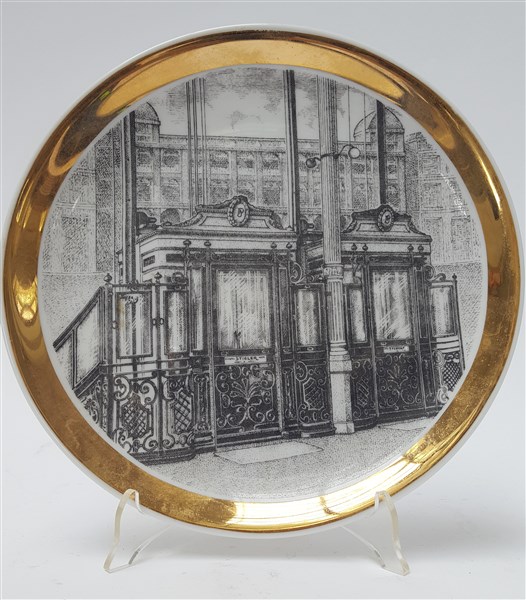 Piatto della serie "Gli ascensori". Milano, anni '70. Porcellana serigrafata in nero, bordo dorato. Marcato al verso. (d cm 25) (lievi difetti)