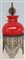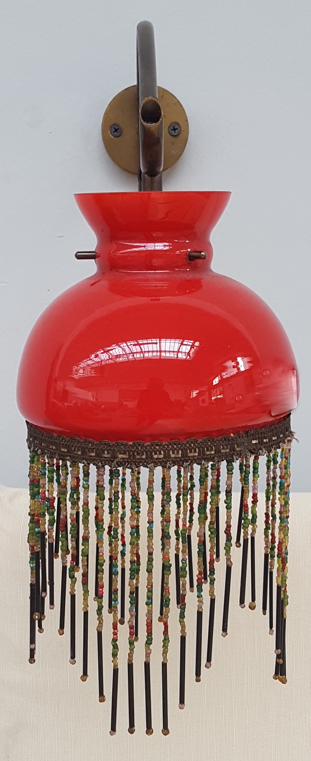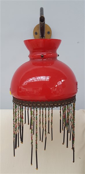 Coppia di lampade da parete a una luce con paralume in vetro incamiciato rosso, struttura in ottone e pendenti policromi. Italia, anni '60. (h cm 20) (difetti e mancanze)