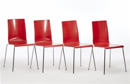 Lotto composto da quattro sedie modello "Lilly". Italia, produzione recente. Acciaio e polipropilene rosso. (cm 50x86x50)