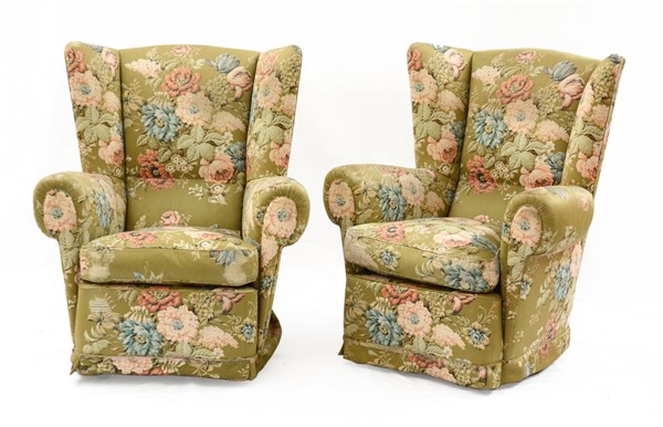 Coppia di bergère su rotelle rivestite in tessuto a fiori. Italia, anni '60/'70. (cm 80x102x85) (lievi difetti e restauri)