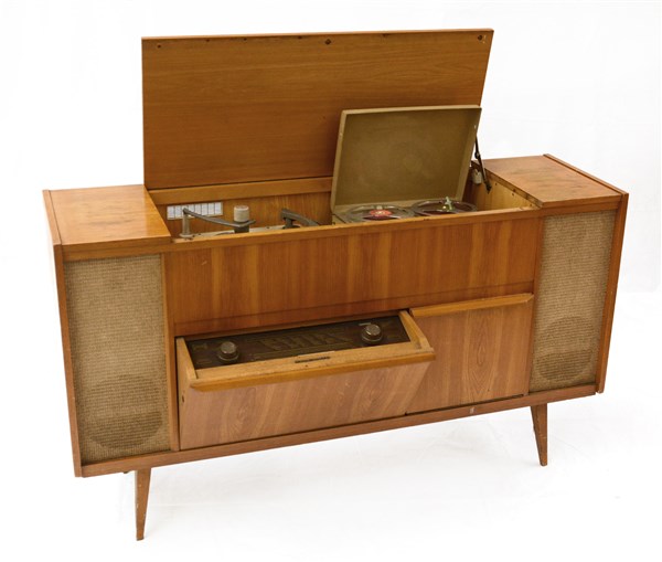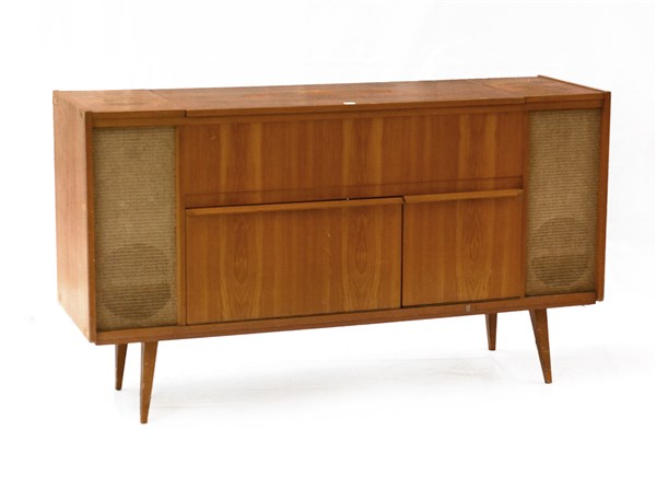 Mobile radio con giradischi e magnetofono modello "Belcanto". Germania, anni '50. Struttura in legno impiallacciato. (cm 142x80x40) (difetti)