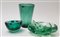 Lotto composto da un vaso con inclusione regolare di bolle, una ciotola e una ciotola con pestello in vetro trasparente verde. Seconda metà secolo XX. (h max cm 19,5) (lievi difetti)