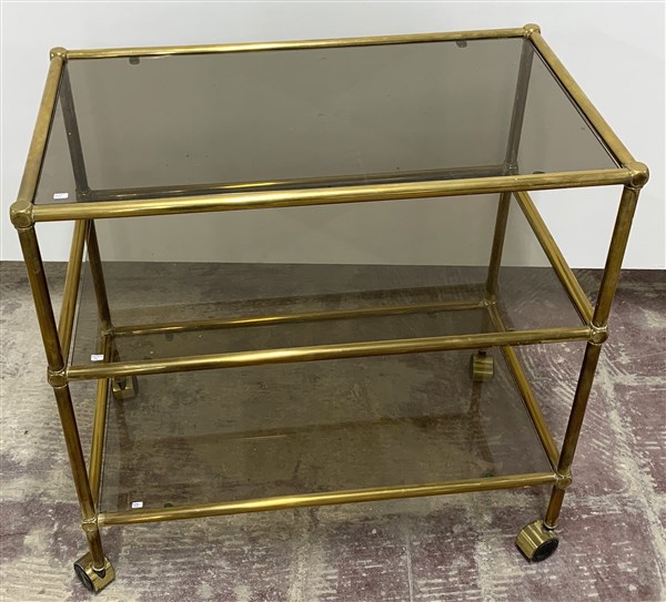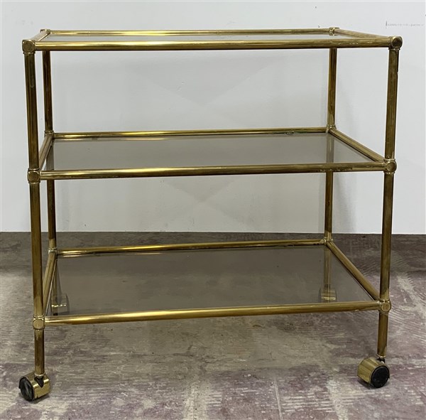 Carrello portavivande con struttura in ottone a tre ripiani in vetro fumé. Italia, anni '70. (cm 77x77x44) (difetti)